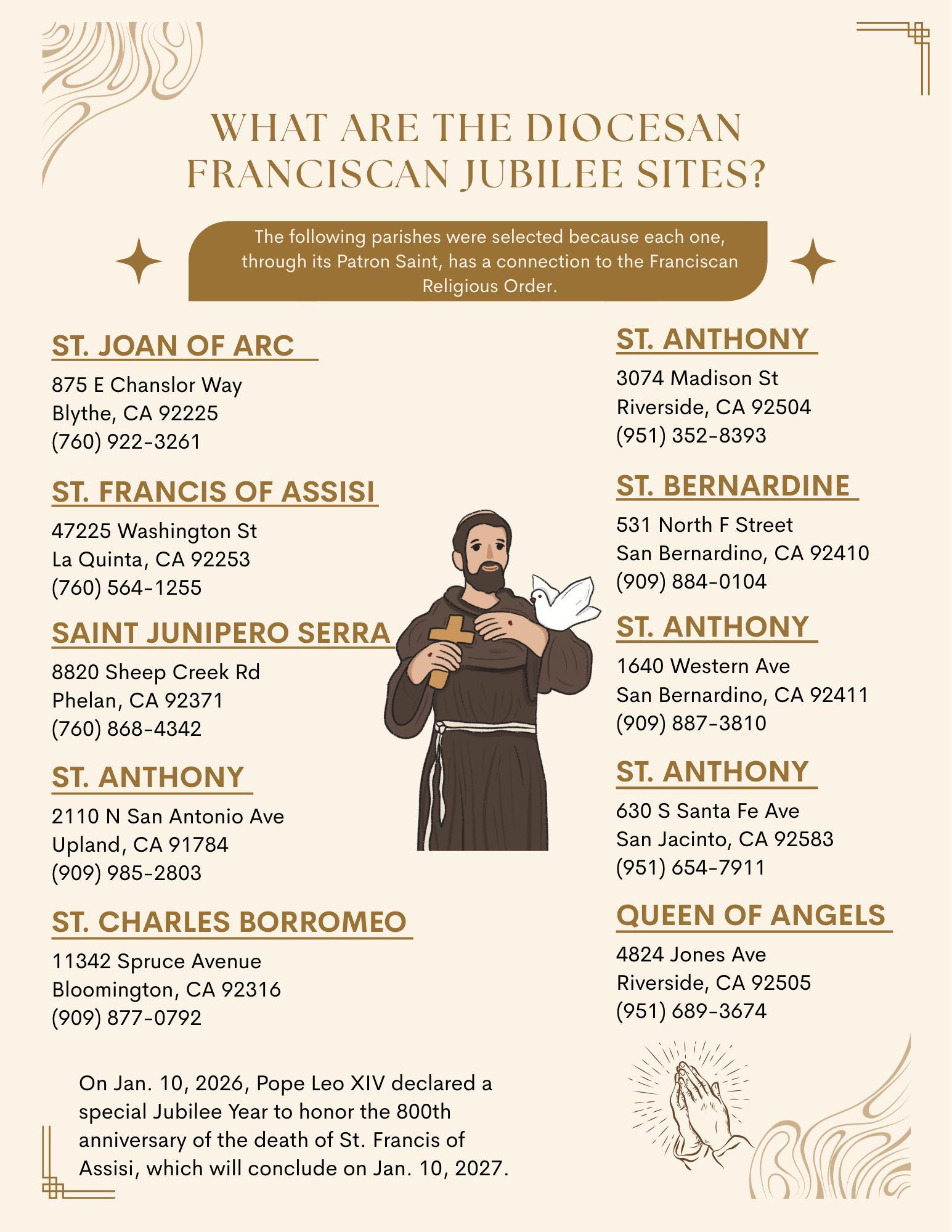 Until Jan. 10 of next year, the faithful can obtain this grace under the usual conditions — sacramental confession, Communion, and prayer for the intentions of the Pope — by making a pilgrimage to any Franciscan conventual church or place of worship dedicated to St. Francis anywhere in the world (see the listing of Franciscan parishes in the diocese at right).