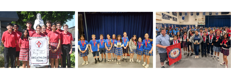 For the fourth year in a row St. Margaret Mary School in Chino took first place in the Junior High Academic Decathlon, held this year on March 7 at Aquinas High School. Catholic school students in grades 6-8 went head-to-head in the annual, one-day competition with eight different schools participating through a total of 14 teams. St. Margaret Mary’s Red Team was the overall winner, taking second place overall was Sacred Heart School, Palm Desert, and taking third place was St. Edward School, Corona. During the decathlon, students participate in team and individual competition of rigorous thinking problems, Roman Catholic doctrine, Literature, Science, Mathematics, Currents Events, Social Studies and more. Congratulations to all of the decathletes! St. Margaret Mary and Sacred Heart participated in the National Decathlon competition, held virtually, on March 20.